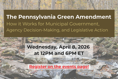 Hear expert speakers discuss PA Green Amendment obligations and opportunities for municipal government officials, state regulatory agencies, and state legislators. Register through the Green Amendments Calendar.
