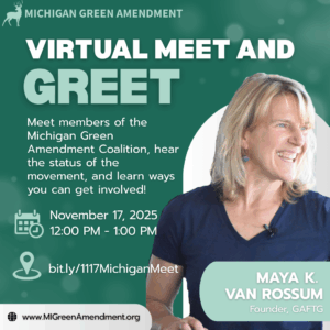 Grab your lunch and meet us online to talk about the Michigan Green Amendment movement — where we stand, what we’re up to, and how you may want to get involved! You will get the chance to talk to Michigan Coalition members about their experience and chat with Maya K. van Rossum, Founder of the Green Amendment movement.